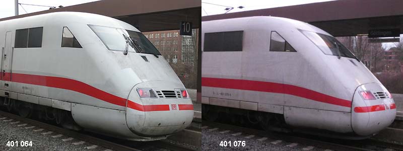 ![]() 401 076-5 und 401 064-1 mit unterschiedlichen roten Streifen am Bug. Göttingen 04.02.2019 (Albert Winkens) |