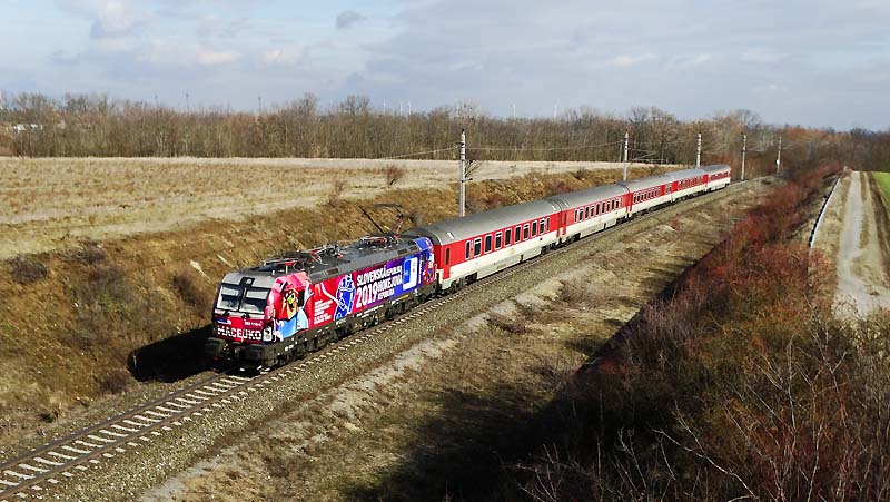 14.02.2019 Neue Werbelok aus der Slowakei.. Die nun als Werbelok fungierende RAILL 383.110 mit dem IC 44 am 13.2.2019 bei Neudorf.... |