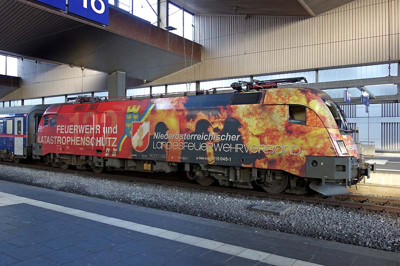 ![]() Die auffällig beklebte 1016 048 war am 11.08.19 mit dem Nightjet 420/40490 unterwegs und wurde nach der Ankunft in Düsseldorf fotografiert.(Claudia Rehberg) |