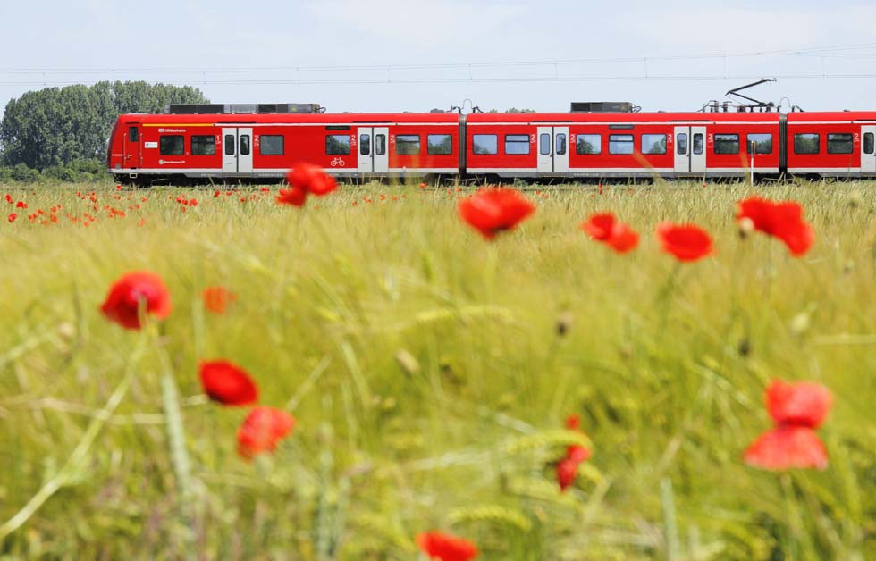 ![]() Eine S-Bahn Baureihe ET 425 inmitten eines Feldes mit Mohnblumen bei Minden (Westf) auf der Strecke Hannover – Minden. (Deutsche Bahn AG / Wolfgang Klee) |