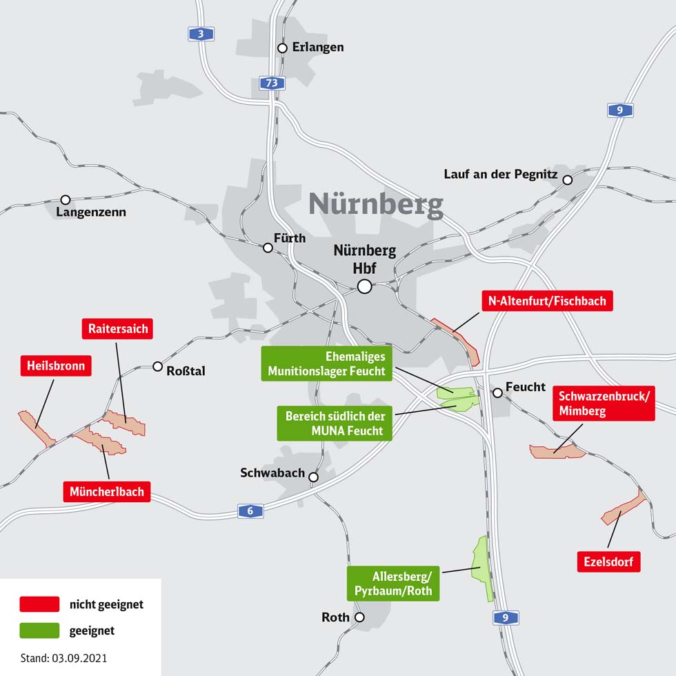 06.09.2021 Neues ICE-Werk Nürnberg: Standortvorauswahl geht in nächste Runde .. Drei Standorte bleiben im Rennen – Sechs Standorte sind für ICE-Werk ungeeignet – DB verspricht weiterhin Transparenz und Dialog – Raumordnung ab Ende des Jahres Die Standortsuche der Deutschen Bahn für ein neues ICE-Werk im Raum Nürnberg kommt voran. Aus der bisherigen Vorauswahl der DB von neun möglichen Standorten sche... |