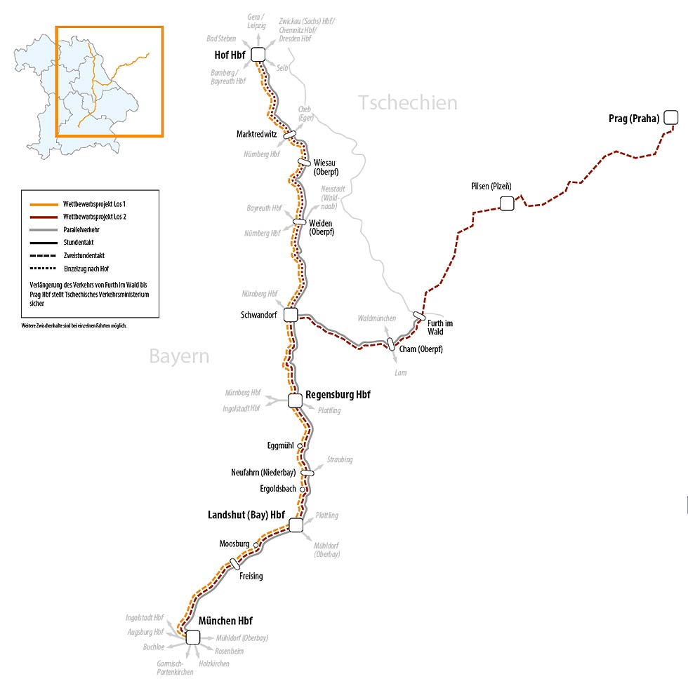 16.03.2021 BEG schreibt Expressverkehr München – Hof/Prag neu aus.. Trennung der Linien nach Hof und PragStündliche Direktverbindung Schwandorf – MünchenDie Bayerische Eisenbahngesellschaft (BEG), die den Regional- und S-Bahn-Verkehr in Bayern im Auftrag des Freistaats plant, finanziert und kontrolliert, hat das Wettbewerbsverfahren Expressverkehr Ostbayern Übergang eröffnet. Das Netz umfasst... |