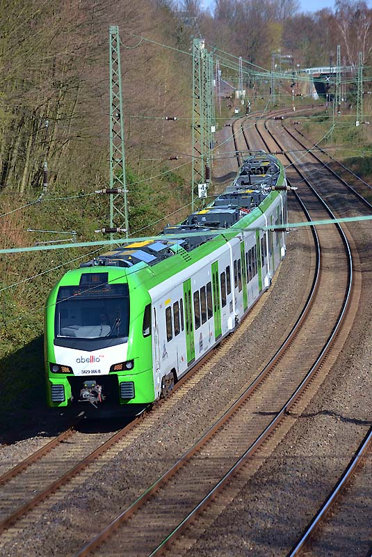![]() 3427 006A-B (Abellio) im Einsatz am 23.03.2020 auf S2 nach Essen Hbf als 30245 (Sonderfahrplan) kurz vor dem Ziel in Kray (Markus Tigges) |