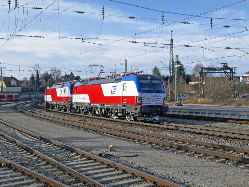 ![]() Traunstein, 20.12.2019: 193 915 von Serbia Cargo fährt mit der abgebügelten 193 916 Serbia Cargo auf Gleis 3 in den Bahnhof Traunstein ein. Damit sind diese noch fehlenden Lokomotiven unterwegs in ihre neue Heimat. |