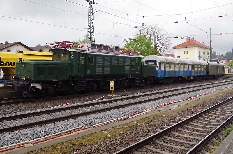 ![]() Eine Detailaufnahme von E 94 088 (in Bestzustand), dem Umbauwagen (in recht zerzaustem Zustand...) der ungebremst mitläuft und als Abschluss dem Aufenthalts-Bremswagen der GES (vmtl. ex ÖBB, auch gut in Schuss). |