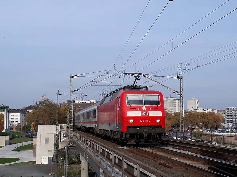 ![]() 120 111 mit Ersatz IC am 9.11. kurz vor Erreichen des Zielbahnhofs Frankfurt- Süd. |