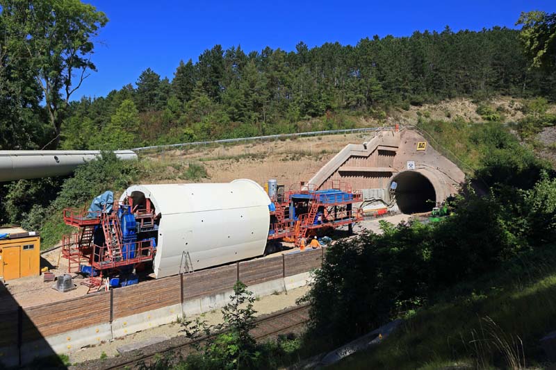 ![]() Der fast 120 Jahre alte Zierenberger Tunnel auf der Strecke Kassel - Korbach hatte das Ende seiner technischen Nutzungsdauer erreicht. Deshalb wurde er durch einen Neubau ersetzt. Nördlich des Zierenberger Tunnels entstand in Parallellage die neue 900 Meter lange, eingleisige Röhre. Vor dem Westportal des entstehenden Tunnels stand im August 2016 ein Teil der Innenschalung für die 40 Zentimeter dicke, wasserundurchlässige Betonkonstruktion zur Auskleidung des Tunnels. Im Vordergrund die Bestandsstrecke von Kassel nach Wolfhagen. (Deutsche Bahn AG / Uwe Miethe) |