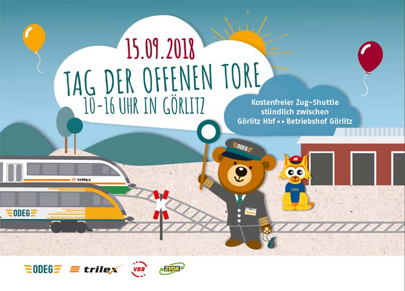28.08.2018 ODEG: Einladung zum „Tag der offenen Tore 2018“ in Görlitz.. Samstag, 15. September 2018, 10.00 bis 16.00 Uhr, ODIG-Betriebshof, Reichenbacher Straße 1Am 15. September 2018 heißt es in Görlitz „Herzlich Willkommen“ zum Tag der offenen Tore. Die ODEG – Ostdeutsche Eisenbahn GmbH und der trilex (Die Länderbahn GmbH DLB) laden an diesem Tag in den Betriebshof der ODIG – Ostdeutsche ... |