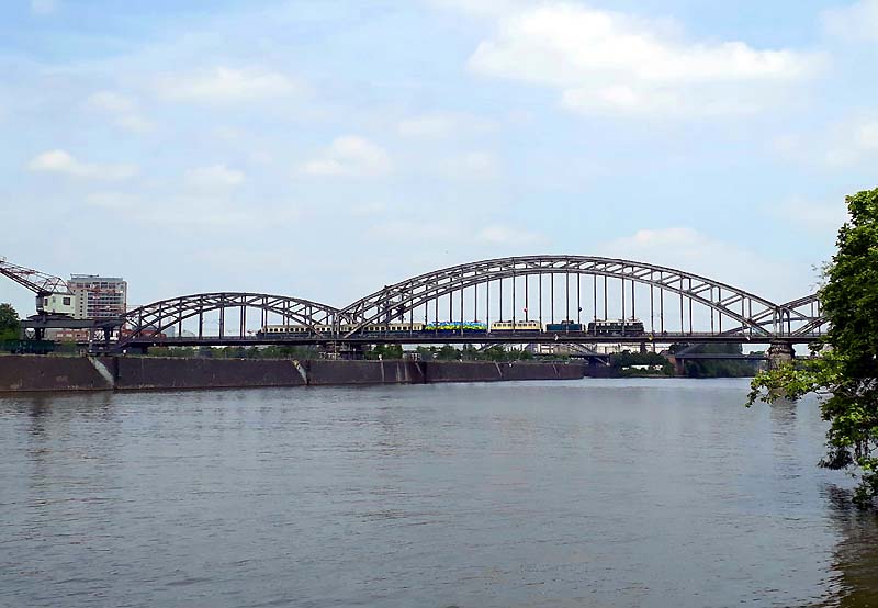 ![]() E 40 128 mit der DB- Museumsfuhre (212 001, E 10 1239 und 103 220) am 14. Juni 2018 auf der Deutschherrenbrücke bei Frankfurt Ost. (Oli Diel) |