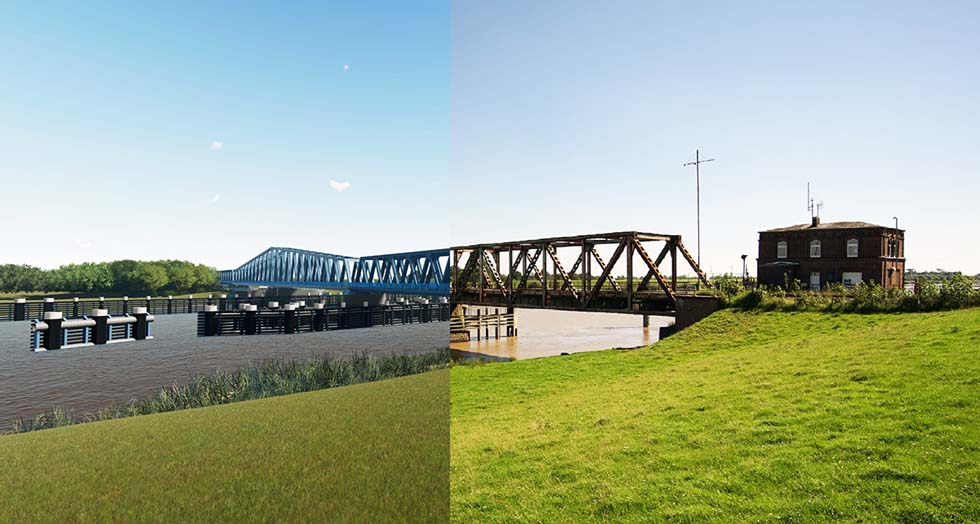 ![]() Friesenbrücke vorher nachher Ansicht: Vorbild Friesenbrücke bei Weener (Visualisierung, links neu, rechts alt). Als technisches Duplikat soll die neue Huntebrücke errichtet werden. (ARGE Friesenbrücke) |