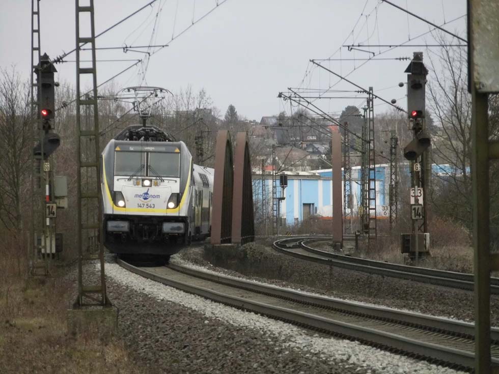 ![]() Elze, 04. März 2023: 147 543 mit RE2 nach Göttingen passiert die Riehebrücke in der südlichen Bahnhofseinfahrt. (Thomas Förster) |
