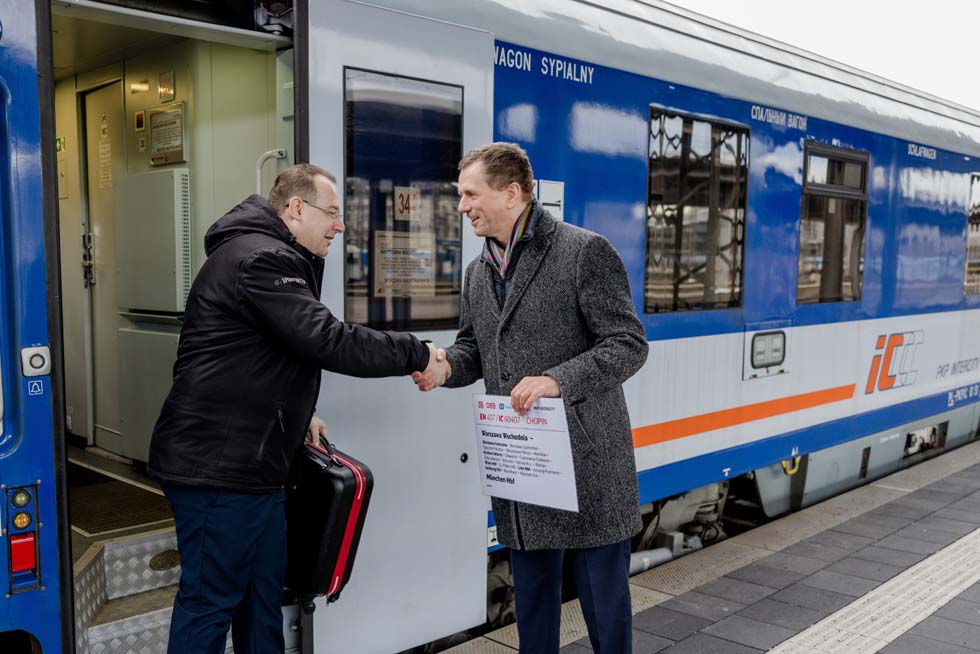 ![]() Klaus-Dieter Josel (DB AG, Konzernbevollmächtigter für den Freistaat Bayern) (rechts) begrüßt Robert Czerniak (PKP Intercity, Vertreter des Vorstands). (DB AG/La Rocca ) |