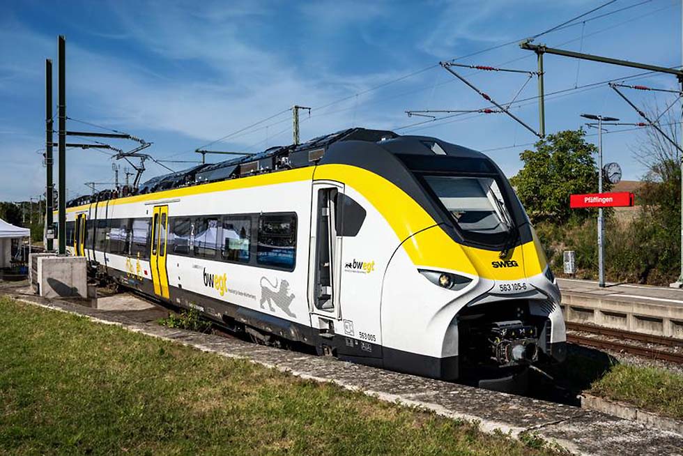 ![]() Ein Serien-Batteriezug von Siemens machte an der Batteriezug-Schnellladestation VOLTAP in Ammerbuch-Pfäffingen zu Testzwecken Halt. (Foto: swt/Marquardt) |