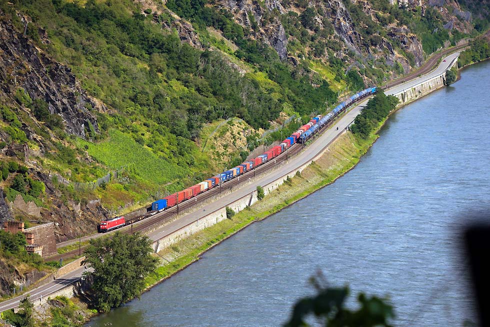 ![]() Güterzug des Kombinierter Ladungsverkehr der DB Cargo mit Ellok Baureihe 185 im Jahr 2024 auf der rechten Rheinstrecke gegenüber Oberwesel (vom Günderode-Haus gesehen) (Deutsche Bahn AG / Wolfgang Klee) |