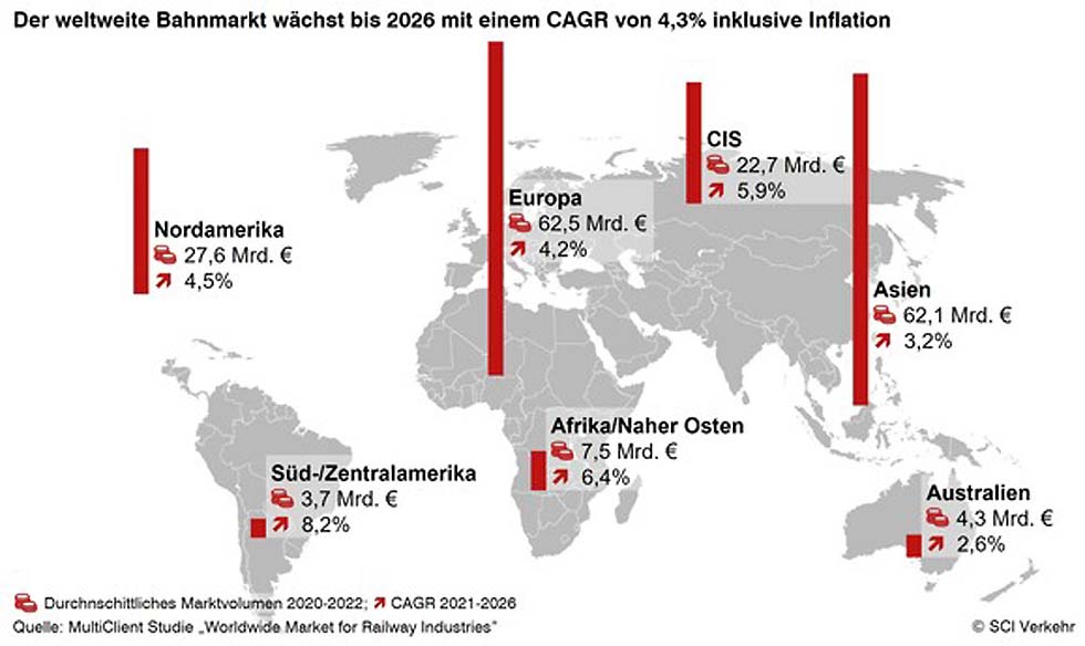 02.09.2022 SCI: Die weltweite Bahnindustrie wächst trotz multipler Krisen .. Die weltweite Bahnindustrie wächst trotz multipler Krisen jährlich bis 2026 real noch um 1,6%Das Marktvolumen der weltweiten Bahnindustrie liegt derzeit bei rund 190 Milliarden Euro. Gestörte Lieferketten und Zurückhaltung in Folge der Covid-19 Pandemie haben die Industrie zuletzt gebremst. Bis 2026 erwartet SCI Verkehr ein Wac... |