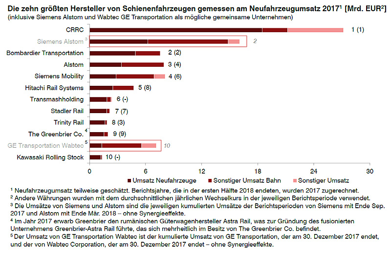 | 09.11.2018 Konsolidierungsprozesse der globalen Schienenfahrzeugindustrie nehmen Fahrt auf.. - Chinesischer Hersteller CRRC weltweit führend - Neue Herstellerstudie der SCI Verkehr GmbHFusionsabsichten wie die von Siemens und Alstom oder von General Electric (GE) und dem führenden Bahnzulieferer Wabtec halten die Bahnbranche wie die Kartellbehörden in Atem. Dabei hatte sich von 2015 auf 2017 der Umsatzanteil der Top 10 ... |