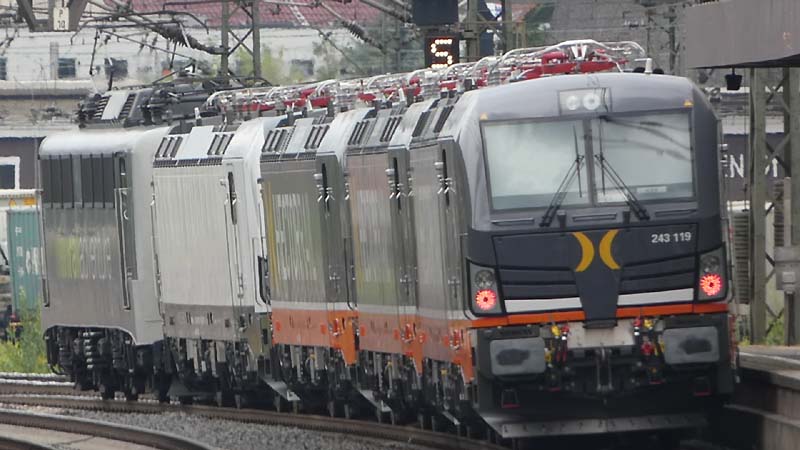 30.07.2018 Wieder Hectorrail-Vectrons in den Norden überführt.. Am 28. Juli 2018 brachte die 139 558-1 von Railadventure 4 Vectrons für Hectorrail in den Norden. Im Zugverband liefen zunächst die noch weiße Siemens-Vorratsloks 193 971-9, die allerdings lautr NVR-Nummer ebenfalls für Hectorrail bestimmt ist, gefolgt von 243 117, 120 und 119 in Hectorrail-Farbgebung. Die AUfnahme zeigt den Zu... |