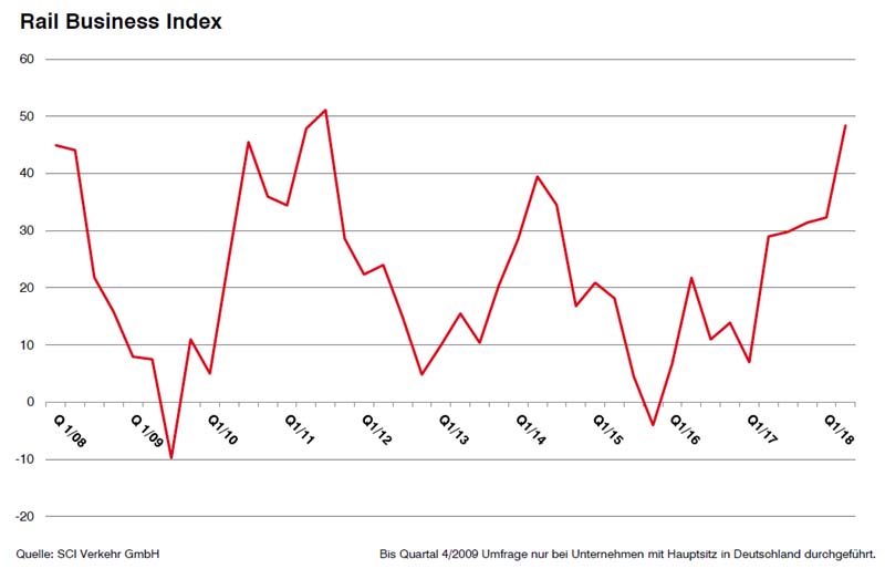 11.07.2018 SCI Global Rail Index 2/2018: Geschäftsklima erreicht beachtlichen Spitzenwert im zweiten Quartal 20.. Das Geschäftsklima unter den führenden Unternehmen in der globalen Bahnindustrie profitiert von der guten Auftragslage und steigt noch einmal deutlich im zweiten Quartal 2018 auf ein Siebenjahreshoch. Dies zeigt der aktuelle SCI RAIL BUSINESS INDEX – eine regelmäßige Befragung der Top-Manager der weltweiten Bahnbranche durch ... |