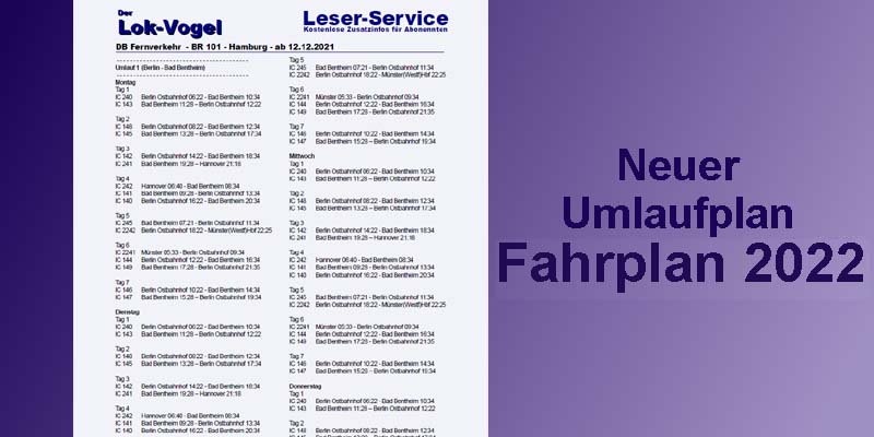 26.01.2022 Neuer Umlaufplan für Abonnenten: BR 101 Hamburg.. Nachdem wir nun endlich Zeit gefunden haben, die ersten Umlaufpläne zu bearbeiten, geht es mit dem begehrtesten Plan los. Die Baureihe 101 ist aufgrund der begonnenen Abstellung und der neuen Werbeloks derzeit sehr gesucht. Wir haben den kompletten Plan für Abonnenten soweben im Abobereich veröffentlicht. ... |