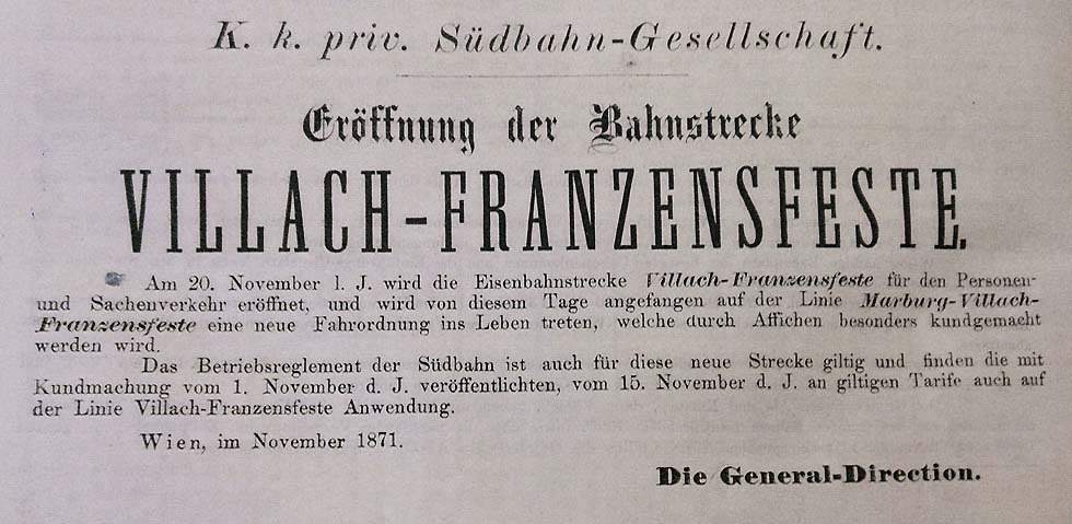 ![]() Die offizielle Mitteilung zur Eröffnung der Bahnstrecke 1871 (STA/Tiroler Photoarchiv) |