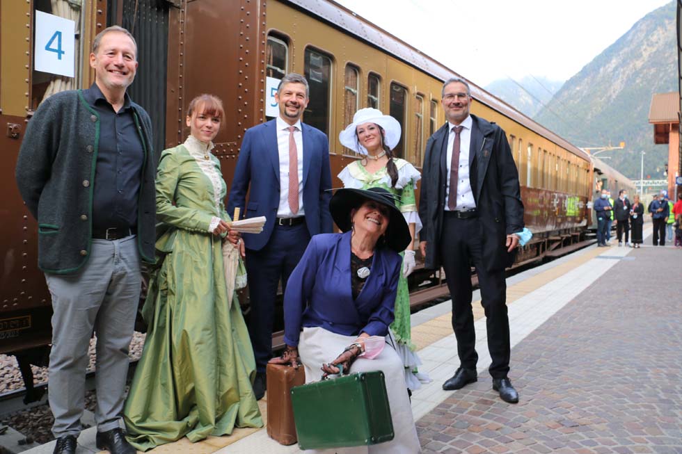 ![]() Startpunkt der nostalgischen Bahnfahrt in Franzenfeste mit LR Bessone (l.), LR Alfreider (Mitte) und LH Kompatscher (r.) (Foto: LPA/Ingo Dejaco) |
