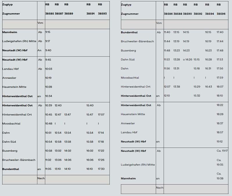 Zug fährt morgens gegen 9:15 Uhr ab Mannheim und anschließend über Ludwigshafen, Neustadt/W und Landau in die Südwestpfalz Abschied von den Nahverkehrswagen der früheren Bundesbahn: Zum Einsatz kommt ein lokbespannter Regionalbahnzug mit Extraplatz für viele Fahrräder Herausgeber: Zweckverband Öffentlicher Personennahverkehr Rheinland-Pfalz Süd Kaiserslautern: Schon traditionell organisiert und finanziert der ZÖPNV Süd die Fahrten aus dem Rhein-Neckar-Raum und Neustadt/W zum beliebten Martinimarkt in Dahn. Am kommenden Sonntag, dem 6. November 2022 fährt anstelle des obligatorischen Triebwagens ein Regionalbahnzug der 1990er Jahre. Der Zug besteht aus einer Lokomotive der Baureihe 218 und drei roten Nahverkehrswagen, darunter ein Fahrradwagen. Damit will der Zweckverband ÖPNV RLP Süd, zum Abschluss der saisonalen sogenannten Ausflugszüge für das Jahr 2022, Tagestouristen mit Fahrrädern die Möglichkeit bieten, einen Besuch des Martinimarktes mit einer Radtour entlang der Wieslauter zu verbinden. Der Zubringerzug verlässt Mannheim um 9:15 Uhr und erreicht nach Halten in Ludwigshafen Mitte, Neustadt/W, Landau und Annweiler gegen 11 Uhr den Bahnhof Dahn Süd unweit vom Marktgeschehen. Anschließend pendelt er auf der Strecke Bundenthal – Hinterweidenthal nach einem Sonderfahrplan. In Hinterweidenthal beginnt der deutsch-französische Pamina-Radweg entlang der Wieslauter und ist wegen seiner steigungsfreien Führung sehr beliebt. Vorbei an Teufelstisch und Jungfernsprung überquert südöstlich von Bundenthal die pfälzisch-elsässische Grenze und führt bis Wissembourg. Von dort startet die Regionalbahnlinie 53 nach Landau bzw. Neustadt/W oder man fährt mit dem Rad durch den Bienwald oder die südpfälzischen Weinberge weiter Richtung Winden oder Kandel. Nähere Informationen hält die Pfalz-Touristik unter https://www.pfalz.de/de/route/dt-frz-pamina-radweg-lautertal#dmdtab=oax-tab1 bereit. Abschied von den früheren Bundesbahn-Zügen Der am 6. November eingesetzte Martinimarkt-Rad-Express besteht aus drei Nahverkehrswagen, die, als letzte ihrer Art im Bereich Nordbaden/südl. Rheinland-Pfalz, in Kürze (möglicherweise noch im November) aufgrund ihres Alters durch die DB Regio abgestellt werden. Es handelt sich um in den 1990er Jahren modernisierte Fahrzeuge, deren baulicher Ursprung in den 1960/1970er Jahren zu finden ist. Damit markieren die Fahrten auch den Abschied der einst allgegenwärtigen Bundesbahnpersonenwagen aus dem rheinland-pfälzischen Nahverkehr. Auch die eingesetzte Lokomotive ist ein Bundesbahn-Klassiker, der in unserer Region nicht mehr planmäßig fährt: Ab Mitte der 1970er Jahre waren die Loks der Baureihe 218 von den Werken Trier, Ludwigshafen, Karlsruhe und vor allem von Kaiserslautern aus auf fast allen nicht elektrifizierten Strecken in Rheinland-Pfalz eingesetzt. Sie zogen D-Züge, Truppentransporte und waren jahrelang unverzichtbar für schwere Schotterzüge oder im schnellen Eilzugverkehr in der Südpfalz sowie entlang von Nahe und Alsenz. Rückfahrt am frühen Abend Die Rückfahrt des Martini-Markt Rad-Express startet in Bundenthal um 17:40 Uhr, fährt in Dahn Süd um 17:53 Uhr ab und erreicht Mannheim gegen 19:30 Uhr. Allerdings ist durch die Pendelfahrten im Wieslautertal und einzelne Zusatzhalte der Züge der Queichtalbahn in Hinterweidenthal Ost eine frühere Rückfahrt möglich. Der Zug fährt nach folgendem Fahrplan: