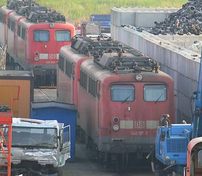 Bender, 12.07.2010![]() ![]() Am frühen Morgen des 12.07.2010 ruhen noch die Arbeiten auf dem Bender-Gelände in Opladen. An der 140 768 (mit durchgestrichenen Loknummern) wurde bereits am Freitag mit der Zerlegung begonnen – der Rahmen wird dann heute wohl verschrottet.140 117, 139 163, 140 551, 140 547 und 140 712 bilden das „Rest-Programm“ in Opladen – bis der nächste Schrottlokzug kommt ... Quelle:/Fotos: Markus Tigges, 12.07.2010 | |