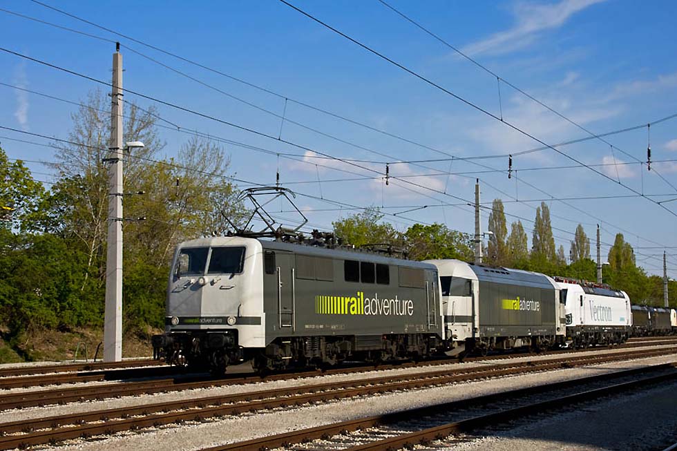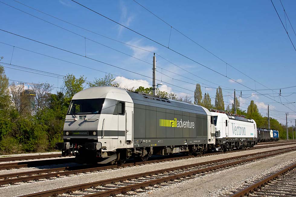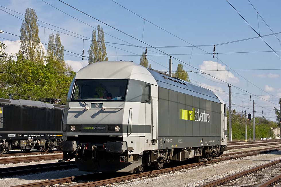 Railadventure 2016 902 in Wien  111 222 mit 2016 902 und 193 968 am 21. April 2023 in Wien Donauuferbahnhof (alle Raimund Whynal) Die von Steiermärkischen Landesbahnen (STLB) an das deutsche Evu Railadventure verkaufte 2016 902 wurde infolge ihrer Veräusserung an das Design des neuen Eigentümers angepasst. Wartungsarbeiten in Wiener Neustadt (!) brachten die frisch lackierte Lokomotive aber schon bald wieder nach Österreich, die Rückfahrt wollte ich mir aufgrund des guten Wetters nicht nehmen lassen und erledigte die Pflicht am Wiener Donauuferbahnhof.