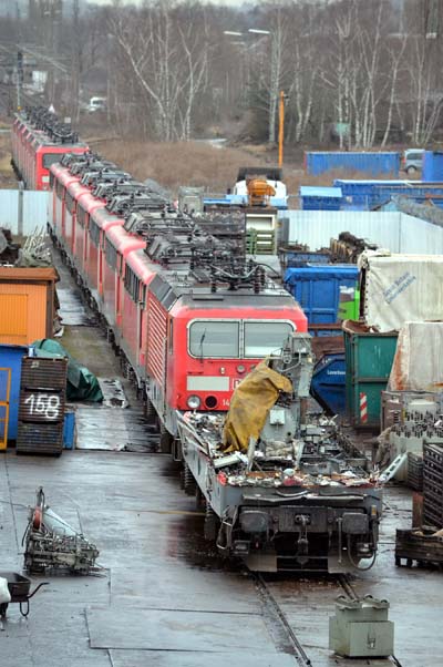 Bender: 143 602 wird zerlegt 143 611 ++ 13.02.2012Die ehemalige Düsseldorfer 143 602 ist aktuell in Bearbeitung. Danach folgt 143 612 und dann die 7x110 und die 6x143 vorm Tor. Quelle:/Fotos: Markus Tigges | |