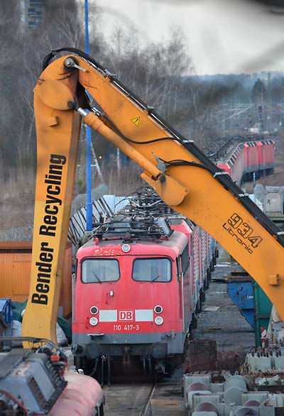 Bender: 110 452 ist zerlegt Und wieder wurde die Reihenfolge der Verschrottung geändert: 110 463 wäre als Nächste dran gewesen, wurde aber vorn in den Stutzen gezogen, stattdessen wurde dahinter die 110 452 zerlegt, von der anscheinend auch wieder Fahrmotoren zurückgegeben werden (stehen abgedeckt zw. 110 417 und 463)110 452 ++ 06.03.2012 Dahinter wartet dann die letzte 110 in der langen Reihe, die 110 417. Quelle:/Fotos: Markus Tigges | |