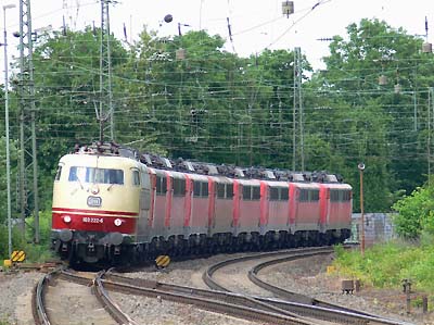 Bender/Opladen, 29/30.05.2010 Zum vergangenen Wochenede gab es zwei Lokzüge nach Opladen:Zuerst die Maschinen aus OB-Osterfeld, die über Wedau und Rath nach Opladen gebracht wurden und noch am gleichen Tag aufs Bender-Gelände überstellt wurden. Im Einzelnen waren es 139 131, 139 316, 140 516, 140 836, 140 854, die am 28.05.2010 zum Bender gebracht wurden. Einen Tag später, am 29.05.2010, folgte der Lokzug 69569. Bestehend aus 8 x 139/140, die von Seelze aus von der FTZ-Lok 103 222 (!) nach Opladen gebracht wurden, um dort ihre Einsatzzeit endgültig zu beenden. Es trifft 140 117, 139 163, 140 337, 140 547, 140 551, 140 712, 140 768 und 140 809. 140 547, 551 und 712 kamen aus Rostock - Seehafen. Überstellung zum Bender voraussichtlich am 31.05.2010. Hier das zuhgehörige Bild von der Ankunft der Fuhre bei der Ankunft (+25) in Opladen Quelle:/Fotos: Markus Tigges, 29/30.05.2010 | |