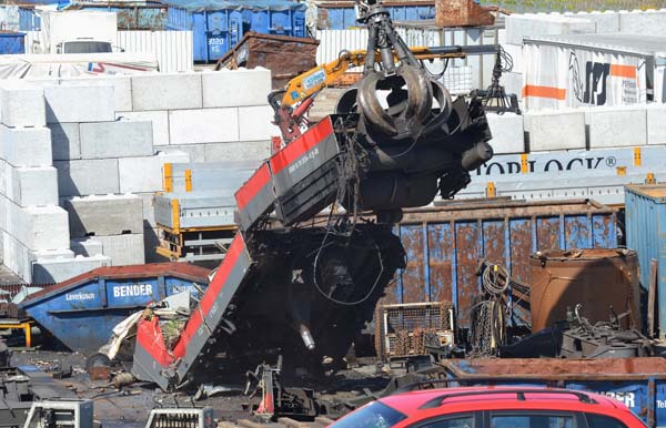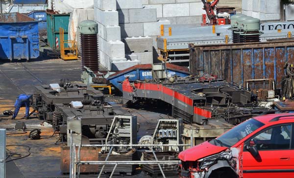Bender: 111 034 ist schon GeschichteDas war gestern am 16.08.2012 nichts für schwache Nerven oder Eisenbahnromantiker:111 034-5 ++ 16.08.2012 Das ein Lok-Rahmen von den Drehgestellen gehoben wurde, sodass diese parallel zerlegt werden können wurde schon öfter beim Bender praktiziert. Das allerdings fast der gesamt Rahmen (sicherlich noch einige Tonnen schwer...) vom Greifer in die Höhe gehievt wurde, weil die zerteilten Rahmenteile noch Leitungen und Kabel zusammenhingen , und dann mit einem ohrenbetäubenden Knall auf den Boden aufschlagen und die Teile dann noch x-mal hin und her gewuchtet wurden bis das Material nachgab, daß konnte ich so auch noch nicht beobachten. Die gute Nachricht ist aber, dass noch einige Teile (z.B. die Fahrmotoren und einige Gerüste?) als Ersatzteile an die DB zurückgehen... Die Ausgangslage: Die Rahmenteile hängen noch zusammen ...