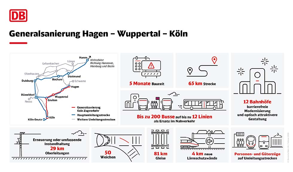 Bauteams bündeln umfangreiches Bauprogramm an Strecke und Bahnhöfen • DB setzt auf Erfahrungen der bisherigen Generalsanierungen • Umleitungs- und Ersatzverkehrskonzept für Züge im Nah-, Fern- und Güterverkehr Die DB InfraGO startet mit der Generalsanierung des wichtigen Bahnkorridors zwischen Hagen, Wuppertal und Köln. Dr. Philipp Nagl, Vorstandsvorsitzender der DB InfraGO, Christian Hirte, Parlamentarischer Staatssekretär beim Bundesministerium für Verkehr, und Oliver Krischer, Minister für Umwelt, Naturschutz und Verkehr des Landes Nordrhein-Westfalen, haben heute Nachmittag in Wuppertal-Elberfeld auf einer der zahlreichen Baustelleneinrichtungsflächen das offizielle Startsignal gegeben. Parallel beginnt heute auch die Generalsanierung auf der Strecke zwischen Nürnberg und Regensburg. Nachdem die DB InfraGO 2025 bereits im Zusammenhang mit dem dreigleisigen Ausbau die Sanierung des Korridors zwischen Emmerich und Oberhausen umgesetzt hat, folgt mit dem Korridor zwischen Ruhrgebiet, Bergischem Land und Rheinland nun die erste große Sanierung in Nordrhein-Westfalen. In den Abendstunden schaltet das Bauteam die Oberleitungen auf der Strecke ab und die fünfmonatige Bauphase beginnt. Fern- und Güterverkehrszüge fahren bis zum 10. Juli 2026 auf Umleitungsstrecken. Für die betroffenen S-Bahn- und Regionalzüge kommen als Ersatz bis zu 200 Busse zum Einsatz. Die Generalsanierung Hagen – Wuppertal – Köln im Überblick Während der Zeit der Generalsanierung zwischen Februar und Juli 2026 erneuert die DB InfraGO zwischen Ruhrgebiet, Bergischem Land und Rheinland 81 Kilometer Gleis, 50 Weichen sowie 29 Kilometer der Oberleitung oder setzt sie umfassend instand. Zusätzlich bauen die Teams knapp vier Kilometer neue Schallschutzwände entlang der Strecke, sodass es für Anwohnende zukünftig deutlich leiser wird. Darüber hinaus setzt die DB InfraGO auf die umfassende Sanierung von zwölf Bahnhöfen. Dabei stehen insbesondere die barrierefreie Modernisierung und eine optisch attraktivere Gestaltung der Stationen im Fokus. Neben den großen Bahnhöfen wie Wuppertal Hauptbahnhof und Solingen Hauptbahnhof profitieren auch kleinere Stationen wie beispielsweise Leichlingen, Haan-Gruiten und Ennepetal. Die Arbeiten an den Bahnhöfen werden auch über den Zeitraum der aktuellen Bauphase hinaus bis Ende 2027 fortgesetzt. Ziel der fünfmonatigen Bauphase ist es, die hochbelastete Eisenbahnstrecke langfristig verlässlicher und leistungsfähiger zu machen. Störungen und damit einhergehende Verspätungen sollen sich so deutlich reduzieren. Busse statt Bahnen im Regionalverkehr, Umleitungen im Fernverkehr Für die Zeit der Bauarbeiten hat die DB InfraGO in Abstimmung mit den Aufgabenträgern und den betroffenen Eisenbahnverkehrsunternehmen ein umfassendes Ersatzkonzept für den Nahverkehr erarbeitet. Dabei setzt die DB auch auf die Erfahrungen der bisherigen Generalsanierungen zwischen Mannheim und Frankfurt sowie zwischen Hamburg und Berlin. Während der umfassenden Sanierung zwischen Hagen, Wuppertal und Köln sind die vom Schienenpersonenfernverkehr, den RE- und RB-Zügen sowie vom Güterverkehr genutzten Fernbahngleise durchgängig gesperrt. Zusätzlich sind in drei Phasen auch die S-Bahn-Gleise wegen umfassender Arbeiten an den Bahnhöfen nicht nutzbar. Über den gesamten Bauzeitraum kommen auf den betroffenen Nahverkehrs- und S-Bahnlinien Ersatzbusse zum Einsatz. Dabei setzen die DB sowie die Aufgabenträger und Eisenbahnverkehrsunternehmen wie üblich auf einen Mix aus Bussen, die alle Haltestellen anfahren sowie Expressbusse mit ausgewählten Halten. Die Busse sind in unterschiedlichen Takten von zehn bis 60 Minuten unterwegs. Die genauen An- und Abfahrtszeiten sind in den elektronischen Auskunftsmedien enthalten. Fahrgäste können die Fahrten der Ersatzbusse zudem online über eine LiveMap einsehen. Für die Ersatzverkehre während der Generalsanierungen hat die DB in Abstimmung mit den Aufgabenträgern einheitliche Qualitätsvorgaben sowie ein konsistentes Erscheinungsbild in der Farbe Verkehrspurpur definiert. Diese Standards kommen aktuell auf dem Korridor zwischen Hamburg und Berlin zur Anwendung und greifen auch für die Ersatzverkehre auf der Strecke Hagen – Wuppertal – Köln. Dazu gehören unter anderem neuwertige und barrierefrei zugängliche Fahrzeuge, die ausreichend Stauraum für Gepäck bieten und über WLAN an Bord verfügen. Die Fernverkehrszüge werden während der Bauarbeiten grundsätzlich zwischen Köln und Dortmund via Düsseldorf und Essen umgeleitet oder entfallen auf dem Teilabschnitt zwischen Köln und Dortmund. Die Halte in Wuppertal Hbf, Solingen Hbf und Hagen Hbf entfallen. Ab Köln steht Fahrgästen eine stündliche ICE-Direktverbindung von/nach Berlin via Düsseldorf, Duisburg, Essen und Bochum zur Verfügung. Die Fahrzeit verlängert sich dabei um etwa 20 bis 30 Minuten. Die Züge der IC-Verbindung Stuttgart – Mainz – Köln – Hannover – Magdeburg – Dresden verkehren nur auf den Abschnitten zwischen Stuttgart und Köln sowie zwischen Dortmund und Dresden. Ab dem 15. Mai bestehen ab Hagen Hbf wieder zweistündliche ICE-Verbindungen von/nach Berlin.