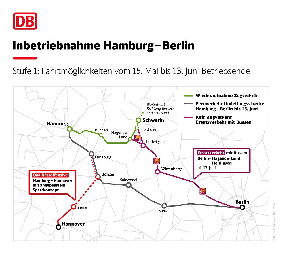 Das Konzept für die Inbetriebnahme der Strecke Hamburg – Berlin nach der Korridorsanierung steht: Der Zugverkehr wird in zwei Stufen wieder anlaufen. Mit Betriebsbeginn am 15. Mai können Züge wieder über den fertiggestellten nördlichen Streckenabschnitt von Hamburg bis Hagenow Land fahren. Damit ist auch die Voraussetzung geschaffen, dass die Verkehre von Hamburg in Richtung Schwerin/Mecklenburg-Vorpommern wieder im gewohnten Fahrplan fahren. Die komplette Wiederinbetriebnahme der gesamten Strecke Hamburg – Berlin erfolgt zum kleinen Fahrplanwechsel am 14. Juni mit Betriebsbeginn. Fahrgäste und Güterverkehrskunden profitieren dann von einer umfangreich erneuerten und verlässlichen Infrastruktur, pünktlicheren Zügen und mindestens fünf Jahren Baufreiheit. Neben 165 Kilometer Gleisen und fast 250 Weichen wurden sechs neue sogenannte Überleitstellen geschaffen sowie sechs neue Stellwerke gebaut und 19 weitere modernisiert. Zudem wurden 28 Stationen entlang der Strecke – teilweise grundlegend – modernisiert. Die umfassenden Verbesserungen durch die Korridorsanierung ermöglichen unter anderem mehr Bahnverkehr auf der Strecke als vorher. Gerd-Dietrich Bolte, Vorstand Infrastrukturplanung und -projekte der DB InfraGO: „Der außergewöhnlich starke und langwierige Wintereinbruch in Norddeutschland hat unsere eingeplanten Zeitpuffer aufgebraucht. Das ärgert uns mindestens genauso sehr wie alle betroffenen Reisenden und Güterverkehrskunden, für deren Geduld wir uns ausdrücklich bedanken wollen. Wir haben gemeinsam mit den beteiligten Unternehmen alles versucht, um die Verzögerungen so gut wie möglich aufzuholen. Das ist uns bedauerlicherweise trotz gewaltiger Anstrengungen aller Beteiligten nicht ganz gelungen. Das zweistufige Inbetriebnahme-Konzept ermöglicht die auch weiterhin dringend notwendigen Baumaßnahmen angrenzender Strecken.“ Wochenlang anhaltender Frost und eine nahezu durchgängig geschlossene Schneedecke hatten seit Anfang Januar den Baufortschritt ausgebremst. Mit einsetzendem Tauwetter haben DB InfraGO und Baufirmen das Personal auf der Baustelle verstärkt, um den entstanden Rückstand bestmöglich aufzuholen. In den kommenden Wochen stehen u.a. noch die Endmontage der Leit- und Sicherungstechnik sowie der Oberleitungen bevor, ein Softwareupdate im Stellwerk Schwerin sowie umfangreiche Arbeiten an den Bahnhöfen. Stufe 1 – Zugverkehre ab dem 15. Mai im nördlichen Streckenabschnitt: Regionalverkehr: Zwischen Hamburg und Schwerin und weiter nach Rostock und Stralsund fahren die Regionalzüge wieder durchgehend. Damit entfällt auch ein Großteil des Busersatzverkehrs. Für alle weiteren Nahverkehrsverbindungen bleibt der Ersatzverkehr mit Bussen bis zum 13. Juni bestehen. Auch die angepassten Nahverkehrslinien bleiben bis zur vollständigen Wiederinbetriebnahme der gesamten Strecke erhalten, um beispielsweise weiterhin direkte Fahrten zwischen Schwerin und Berlin (RE 85) anbieten zu können. Um Umleitungswege für den Güterverkehr zu ermöglichen, kommt es ab dem 15. Mai jedoch zu Teilausfällen auf der Linie RE 4 (Bützow – Lalendorf) sowie auf der RE 50 (Rostock – Langhagen). Die RE 5 verkehrt verändert über Plaaz anstelle über Güstrow. Fernverkehr: Am aktuell bestehenden Angebot ändert sich bis einschließlich 13. Juni nichts. Es fahren weiterhin stündlich direkte ICE-Züge sowie täglich zwei bis drei Flixtrains zwischen Hamburg und Berlin auf der Umleitungsstrecke über Uelzen und Stendal. Die ICE halten auch in Salzwedel und Stendal und meist stündlich wechselnd zusätzlich in Lüneburg bzw. Uelzen. Die Fernzüge zwischen Hamburg und der Ostsee verkehren wieder auf dem Regelweg über Schwerin. Der Güterverkehr wird über Hamburg – Verden – Hannover, Hamburg – Uelzen – Stendal sowie über Hamburg – Schwerin – Neustrelitz – Berlin umgeleitet. Grafische Darstellung der Strecke Hamburg-Berlin Stufe 2 – Vollständige Inbetriebnahme ab 14. Juni: Am Morgen des 14. Juni 2026 erfolgt im zweiten Schritt die Inbetriebnahme des gesamten Korridors Hamburg – Berlin. Dann fahren wieder alle Fern-, Regional- und Güterzüge auf ihrem Regelweg. Dabei wird das Angebot für Fahrgäste größer sein als früher – Flixtrain fährt zusätzlich zu den halbstündigen ICE im Zweistundentakt. Die DB InfraGO arbeitet das finale Inbetriebnahme-Konzept nun gemeinsam mit den Eisenbahnverkehrsunternehmen schnellstmöglich in die Fahrpläne ein. Anschließend werden die Fahrplanauskünfte auf bahn.de und im DB Navigator aktualisiert. Umfangreiches Bauvolumen während der Korridorsanierung Insgesamt wurden während der Korridorsanierung bereits mehr als 165 Kilometer Gleise und fast 250 Weichen erneuert und die sogenannte feste Fahrbahn im Abschnitt zwischen Wittenberge und Dergenthin durch einen Schotteroberbau ersetzt. Sechs neue sogenannte Überleitstellen schaffen künftig mehr Stabilität und Flexibilität im Betrieb. Zudem erneuert die DB InfraGO die Leit- und Sicherungstechnik, errichtet sechs neue Stellwerke und modernisiert 19 weitere. Damit werden Stellwerke und Achszähltechnik für den künftigen Einsatz des europäischen Zugbeeinflussungssystems ETCS vorbereitet. Die restlichen Inbetriebsetzungen an der Stellwerkstechnik - jeweils im Zulauf auf die Knoten Hamburg und Berlin - müssen noch abgeschlossen werden. Sie haben jedoch keine Auswirkung auf die im Fahrplan vorgesehene Reisezeit und werden nach Fertigstellung einen zusätzlichen Fahrzeitpuffer ermöglichen. Die 28 Bahnhöfe entlang der Strecke modernisiert die DB InfraGO und gestaltet sie attraktiver. Dazu gehören Bahnsteigverlängerungen, Bahnsteigerhöhungen für einen stufenlosen Einstieg in den Zug, längere Bahnsteigdächer und Wegeleitsysteme für Menschen mit Sehbeeinträchtigungen. 20 der 28 Bahnhöfe werden dabei ganzheitlich entwickelt – durch neu gestaltete Personenunterführungen, durchgängige Gestaltungskonzepte sowie mehr Sitz- und Wartemöglichkeiten und 