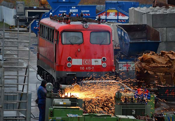 110 470 ++ 05.10.2012 Die 110 415 war am Samstagmorgen gegen 8.30 Uhr auf dem Bender-Gelände anzutreffen, sie ist soweit vorbereitet und wird vermutlich Anfang nächster Woche komplett zerlegt. Hier wurde vor der Lok noch andere Kleinteile zerteilt …. Quelle:/Fotos: Markus Tigges | |