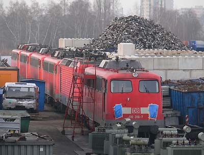 Der Neuzugang 110 316, 143 325, 110 363, 110 322 + 2 weitere 110/115 (aus Köln?) auf dem Hochsicherheitstrakt.