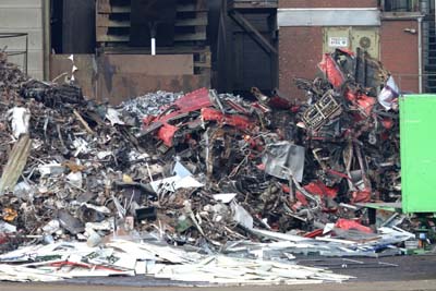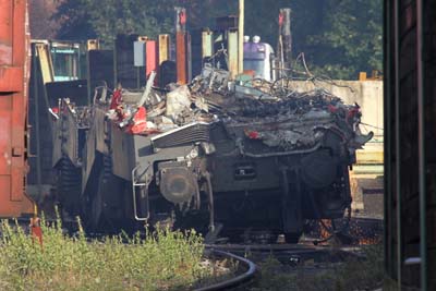 Kleiner Bericht aus Eschweiler-Aue![]() ![]() ![]() ![]() Die 143er - es muss sich wohl um 143 943 handeln - befand sich am Vormittag des 09.10.12 in abschließender Zerlegung. Auf den schlecht einsehbaren Gleisen konnte ich zumindest noch eine 115er entdecken. Der Schrotthaufen lässt erahnen, was mit den anderen passiert sein dürfte - unten rechts erkennt man zum Beispiel einen Teil der Front mit Stirnlampe einer verschrotteten Lok der Baureihe E10. Alle Fotos vom 09.10.2012, mit Ausnahme der 143 943 (Foto vom 30.09.3012) Quelle:/Fotos: Felix M. | |