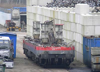 Bender, 09.02.2010![]() 110 420 ++ 08.02.2010 110 411: Zur Mittagszeit stand die halb (bis auf den Rahmen und die Fahrmotorlüfter) zerlegte 110er allein auf dem Gelände - spätestens morgen wird sie dann wohl komplett dem Schneidbrenner zum Opfer fallen (++ 10.02.2010) Quelle:/Fotos: Markus Tigges, 04.02.2010 |
