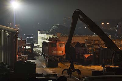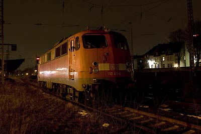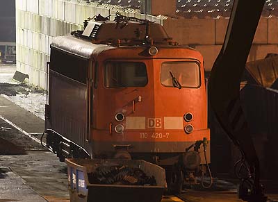 Bender, 03.02.2010 Schon ohne Stromabnehmer steht 110 420 bereits seit Montag innerhalb des Bender Geländes. Der riesige Greifer scheint sich dabei geradezu symbolisch positioniert zu haben. Währenddessen steht 110 411 noch in der Station Opladen, wobei diese Lok bereits ohne Bügel auf dem Dach hier angekommen ist. Bei Tagesanbruch wird sie wohl auch zum Bender überführt. Quelle:/Fotos: shenanigan87, 03.02.2010 |