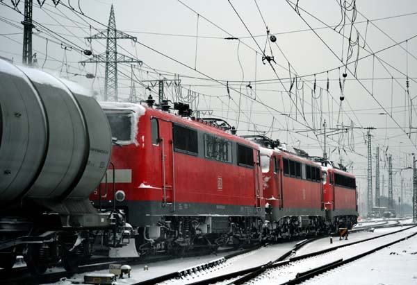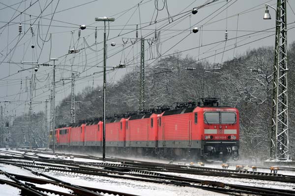 Schrottzüge in Gremberg 111 024 als 70722 (Fürth - Köln Kalk Nord) mit 111 068, 143 869, 052, 888, 890 und 902 im Schlepp am 16.01.2013 kurz vor dem Ziel in Gremberg. 111 072 mit 110 402 und 110 497 hängen an der Übergabe nach Kalk, gezogen von 294 706. Aufgenommen am 16.01.2013 in Gremberg Rbf Nord. Die Vermutung liegt nahe, dass alle Loks in Köln Kalk zusammengezogen werden und dann in den nächsten Tagen von einer 294/296 nach Opladen zum Bender überstellt werden. So kann der Zug auch direkt aufs Bender-Gelände geschoben werden.