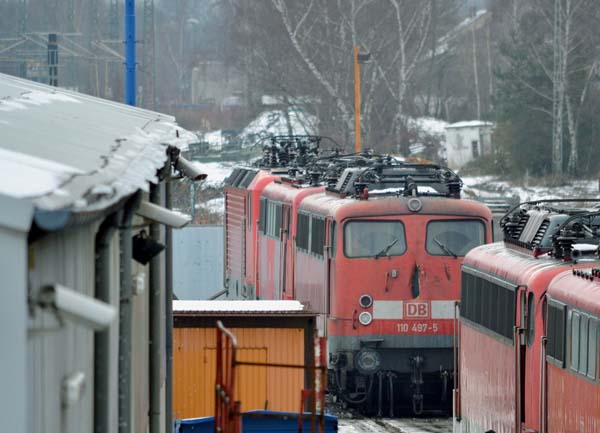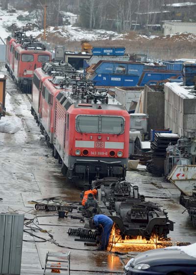 Neues vom Bender 143 052 ++ 28.01.2013Von der 143 052 sind mittags nur noch die Drehgestelle übrig …. die nächste ist 143 869 Durch das vorziehen der Loks ist der Blick frei auf die gut bewachte 110 497, die schon deutliche "Kampfspuren" vom Greifer hat .... hat scheinbar Widerstand geleistet: