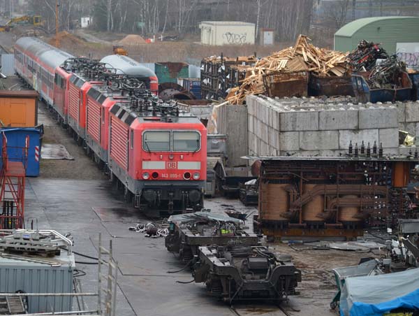 Die 143 895 steht vermutlich als nächste an – vorn die Drehgestelle der 143 094: