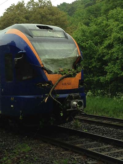 Cantus-Zug kollidiert mit umgestürztem Baum Ein Cantuszug ist heute Morgen, gegen 07.13 Uhr, mit einem umgestürzten Baum kollidiert. Bei dem Aufprall auf das Hindernis wurde die Frontscheibe der Bahn durchschlagen.Der 61-Jährige Lokführer aus Milda (Saale-Holzlandkreis, Thüringen) erlitt schwere Kopfverletzungen und wurde mit dem Rettungshubschrauber in das Kasseler Klinikum gebracht. Der Unfall ereignete sich auf der Bahnstrecke Kassel - Fulda, auf Höhe der Ortschaft Beiseförth. Die etwas 100 Reisenden blieben alle unverletzt. Sie wurden unmittelbar nach dem Unfall mit Bussen weitertransportiert. Der Baum ist offensichtlich infolge der andauernden Regenfälle entwurzelt. Die Schadenshöhe und die Auswirkungen auf den Bahnverkehr stehen noch nicht fest und müssen noch ermittelt werden. Die Bahnstrecke war seit dem Unfall in beide Richtungen gesperrt. Die Aufräumarbeiten sind voraussichtlich gegen Mittag beendet. Das Gleis in Richtung Norden bleibt nach Mitteilung der Deutschen Bahn AG, auf Grund von Witterungseinflüssen, voraussichtlich für längere Zeit gesperrt. Die Bundespolizeiinspektion Kassel hat die Ermittlungen aufgenommen. Quelle:/Fotos: Bundespolizeiinspektion Kassel: Bild: Beschädigte Cantusbahn; Quelle: Bundespolizei | |