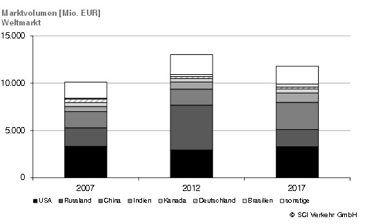 SCI Verkehr: Weltweite Güterwagennachfrage mit 12 Mrd. EUR Volumen auf moderatem WachstumspfadSpitzenjahre 2011/12 werden allerdings aufgrund des massiven Einbruchs der russischen Nachfrage absehbar nicht mehr erreichtNahezu in allen Weltmarktregionen prognostiziert die aktuell erschienene Studie „Güterwagen – Weltweite Marktentwicklungen“ der SCI Verkehr GmbH solide, teilweise sogar gute bis sehr gute Wachstumsraten. So bestellen asiatische Bahnen bis 2017 jährlich über 8 % mehr neue Güterwagen. In Afrika und dem Nahen Osten steigert sich der noch begrenzte Markt sogar jährlich um über 14 %. Nordamerika erlebt derzeit einen Nachfrageboom in diesem Geschäft und wird auch absehbar auf hohem Niveau bleiben. Auch Europa wächst: Nach umfangreichen Ausmusterungen von Altfahrzeugen steigt die Nachfrage hier um knapp 3 % pro Jahr bis 2017. Trotz aller Wachstumsperspektiven in den genannten Regionen trüben die Entwicklungen des bislang wichtigsten Güterwagenmarktes Russland das sonst sehr positive Ergebnis: In Russland bricht die Lieferung neuer Güterwagen nach zwei Jahren mit extrem hoher Beschaffung nun um über 14 % jährlich geradezu ab: Die Nachfrage ist hier offenbar für die kommenden Jahren weitgehend gesättigt.