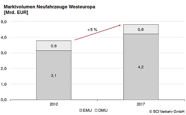 SCI-Studie: Weltweit steigende Nachfrage nach TriebwagenLeitmarkt Europa trotz Krisenstimmung mit kräftigen ZuwächsenDer weltweite Markt für Triebwagen trotzt allen Krisen und wird bis 2017 um gut 4 % jährlich wachsen. In ihrer neuen MultiClient-Studie „Dieseltriebwagen/ Elektrotriebwagen – weltweite Marktentwicklungen" zeigt die SCI Verkehr GmbH, dass insbesondere der stärkste Markt Westeuropa auch über die großen Bestellungen der vergangenen Jahre hinaus ein zuletzt teilweise unterschätztes Potenzial hat. In Deutschland werden in den kommenden Jahren so viele SPNV-Leistungen im Wettbewerb vergeben wie noch nie. Großbritannien hat sein Franchise-Programm neu aufgelegt und auch nach der Vergabe des Thameslink-Vertrages ist der Bedarf aufgrund geplanter Elektrifizierungen groß. In Asien gewinnt der chinesische Markt an Bedeutung, da nach Jahren der Investitionen in Hochgeschwindigkeitsstrecken nun der konventionelle Eisenbahnverkehr in den Fokus gerät. Während der Markt für Elektrotriebwagen fast überall auf der Welt deutlich zulegt, erwartet SCI Verkehr im Dieseltriebwagenmarkt, insbesondere im Leitmarkt Europa, rückläufige Marktvolumina. Auf das Geschäft rund um Elektro- und Dieseltriebwagen entfällt weltweit ein Marktvolumen von etwa 15 Mrd. Euro. Mit über einem Anteil von 80 % sind die Elektrotriebwagen das bedeutendere Geschäftsfeld. Die Märkte für Neufahrzeuge und After-Sales-Services halten sich in etwa die Waage. Weltweit werden knapp 32 000 Elektrotriebwagen und 13 700 Dieseltriebwagen eingesetzt. In Japan, Deutschland, Großbritannien und Frankreich werden die größten Flotten betrieben. Das Durchschnittsalter der Flotte liegt bei 19 Jahren, wobei es regional sehr große Unterschiede gibt. Weltweit ist die Substitution von lokbespannten Zügen mit Reisezugwagen durch moderne Triebwagen noch längst nicht überall vollzogen. Der Eisenbahnpersonenverkehr verzeichnet seit 2004 einen steilen Anstieg, der nur 2009 aufgrund der Wirtschaftskrise kurz gedämpft wurde. In Folge steigender Verkehrsnachfrage einerseits und Infrastrukturerweiterungen andererseits wächst auch der Bedarf an Triebwagen. Notwendige Ersatzbeschaffungen aufgrund alter Flotten setzen vor allem in Afrika, Osteuropa, der GUS und Südamerika Impulse für Neubeschaffungen. Der wichtigste Markt für Triebzüge ist Westeuropa mit einem Anteil von etwa 50 % am weltweiten Markt. Die großen Ländermärkte überstehen die Wirtschafts- und Eurokrise bisher unbeschadet und setzen die Impulse für das künftige Wachstum. In Deutschland steigt das Vergabevolumen für Schienenpersonenverkehrsleistungen bis 2017 auf ein Rekordhoch. Die Ausschreibung großer Netze in Nordrhein-Westfalen oder Baden-Württemberg sowie der S-Bahnsysteme in Hamburg und Berlin versprechen den Fahrzeugherstellern weitere Großaufträge. In Frankreich beginnen noch vor Ende 2013 die Auslieferungen des Régiolis und Régio2N, die SNCF bei Alstom bzw. Bombardier unter Rahmenverträgen über bis zu 1 800 Züge beschafft. Aufgrund der Neuauflage des Franchise-Programms und der Umsetzung geplanter Elektrifizierungen wird der Elektrotriebwagenmarkt auch in Großbritannien nach derzeit schwächeren Jahren wieder zulegen. In Südeuropa gehen die Beschaffungen hingegen aufgrund der wirtschaftlichen Probleme weiter zurück.