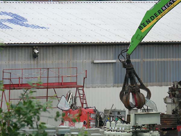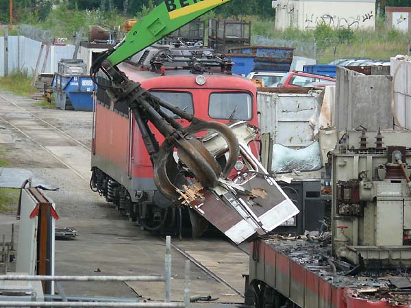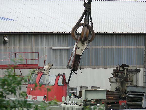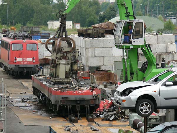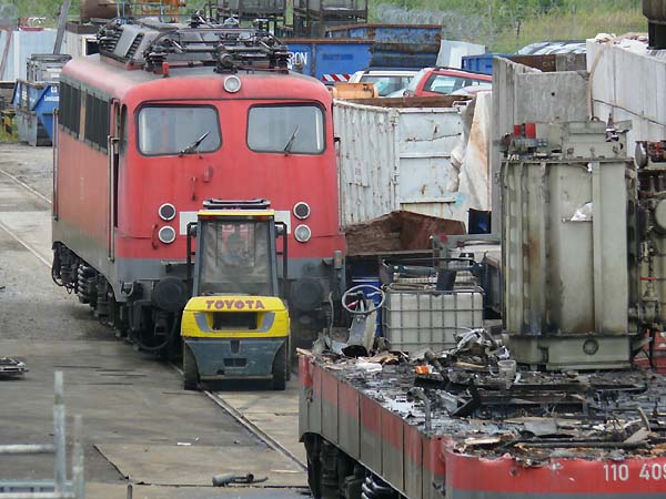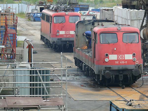 Zerlegung der 110 409 Nachdem ich die 143er Zerlegung verpasst hatte, kam ich am 5. Juli pünktlich zur Beerdigung der 110 409.  Die Jungs haben schon mal angefangen und die Lok von "unnötigen" Ballast befreit.