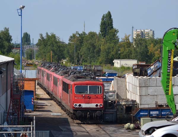 Es tut sich mal wieder was in Opladen...Wie bereits berichtet wurde am 21.07. ein 11-Teiliger Schrottlokzug von Rostock-Seehafen nach Köln-Kalk gefahren. Direkt am folgenden Morgen, 22.07.2013, wurden 155 234, 155 240, 155 263, 155 228, 155 255 zum Bender überstellt. Die restlichen Schrottloks werden vermutlich erst später überstellt, wenn wieder Platz auf dem Bender-Gelände ist. Hier warten die Kandidaten auf den „Vollstrecker“ – an der 155 234 wurde bereits mit den Vorbereitungen begonnen: