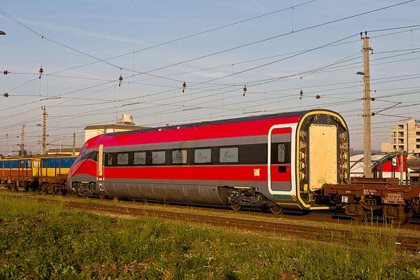 ETR 1000-Endwagen in WienNachdem erst vor wenigen Tagen der Zwischenwagen eines ETR 1000 in den Klima- Windkanal der Railtec Arsenal gebracht überstellt worden ist, traf dort am Dienstag Morgen ein dazugehöriger Endwagen ein. Dank des Hinweises eines guten Fotokollegen konnte ich das Fahrzeug vor seiner Beistellung bildlich festhalten. Gut erkennbar ist dabei der unfertige Zustand dieses ansonsten recht ansprechend gestalteten Fahrzeuges…