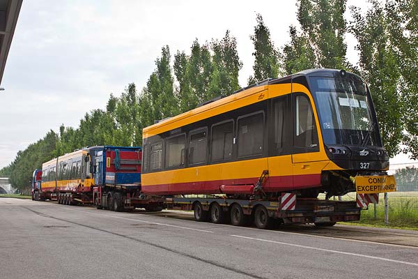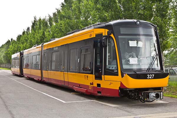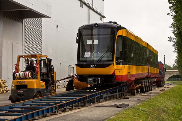AVG-Straßenbahn bei RailTec ArsenalIm Oktober 2011 meldete der Fahrzeughersteller Vossloh einen Auftragseingang zur Lieferung von 25 Niederflur-Stadtbahnen (mit Option auf 50 weitere Fahrzeuge) an die Straßenbahn Karlsruhe, welche bekanntlich von den Verkehrsbetrieben Karlsruhe (VBK) und der Albtal-Verkehrs-Gesellschaft (AVG) betrieben wird. Dabei handelt es sich um dreiteilige und bis zu 80 km/h schnelle Einrichtungswagen aus der „Citylink“ Produktfamilie, welche im spanischen Valencia gefertigt und aktuell ihrer Inbetriebsetzung zugeführt werden. Aufgrund dessen wurde jenes mit der Ordnungsnummer 327 versehenes Fahrzeug in den Klima- Windkanal der RailTec Arsenal nach Wien überstellt, wo es am Dienstag Morgen (27. Mai 2014) eingetroffen ist. Beim bzw. nach dem Abladen konnte ich Wagen 327 im Freigelände der genannten Örtlichkeit mehrmals bildlich festhalten.