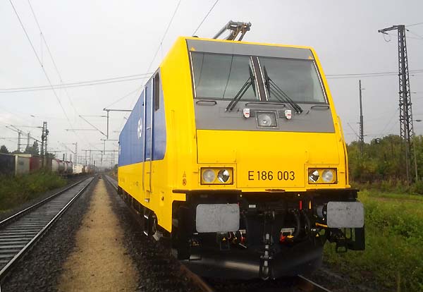 Neubau von Bombardier Kassel: E 186 003Die nagelneue E 186 003 von Bombardier Kassel für die NS, abgestellt in Kassel Rbf. Die Betriebsabnahme erfolgte laut Anschrift am Lokkasten am 27.08.2014.